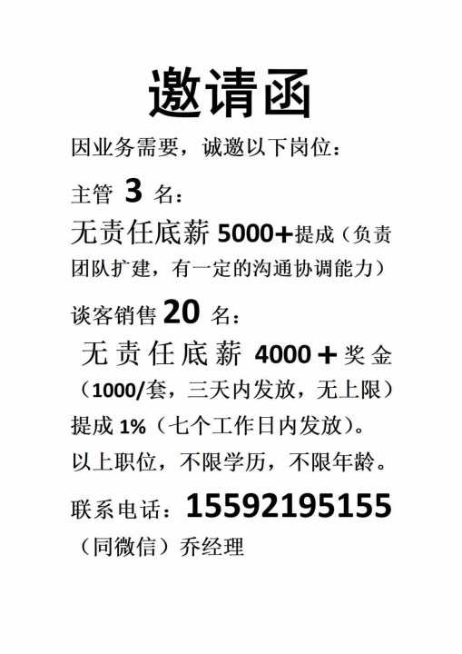 诚聘案场置业顾问20名,无责任底薪4000,奖金1000/套(三个工作日内现金发放)无上限,提成百分之一(七个工作日内发放)